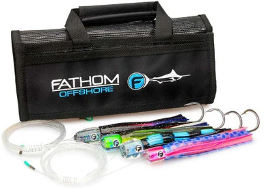 Ready to fish straight out of the package, the Fathom Offshore Pre-Rigged Meat Fish Trolling Lure 4 Pack has everything you need to fill the cooler without the hassle of rigging. These small 7 inch skirted lures are ideal for targeting tuna, dolphin, whaoo, and even smaller billfish like whites and sails. Each lure is pre-rigged on 7 and 8 foot premium monofilament leaders with stainless hook sets. Included are four rigged trolling lures of differing head styles, a reusable roll-up lure bag, and a spread chart that contains tips and instructions on how to most effectively position the lures in your spread.