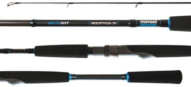 Achieving superior performance marks when used along any coastline, the Nomad Design Inshore Spinning Rods were designed for maximum performance in the world’s most diverse inshore fishing grounds. This series of inshore rods was first developed by Nomad Design with lessons learned from over 20 years of fishing the shallow waters of Australia’s Great Barrier Reef. While they were built for this incredibly diverse and unique angling environment, these inshore rods will feel right at home in the coastal waters of the US pursuing inshore species like striped bass, bluefish, snook, redfish, tarpon, permit? and the list goes on. The tip is designed to be light enough to cast small lures, but stiff enough to impart action to the lure. The medium-fast taper allows enough strength in the butt section to provide stopping power when you need it. Built on blanks made from Nomad’s Helix30T blank system, the blanks feature the latest Japanese 30 Tonne Toray Carbon utilized in a precise carbon wrapping construction that provides enhanced sensitivity, strength, and blank responsiveness. These advanced blanks are fitted with split grip EVA handles, a Fuji GM reel seat, and Fuji Alconite K guides for premium performance on the flats, in the back-bays, or over nearshore reef systems.